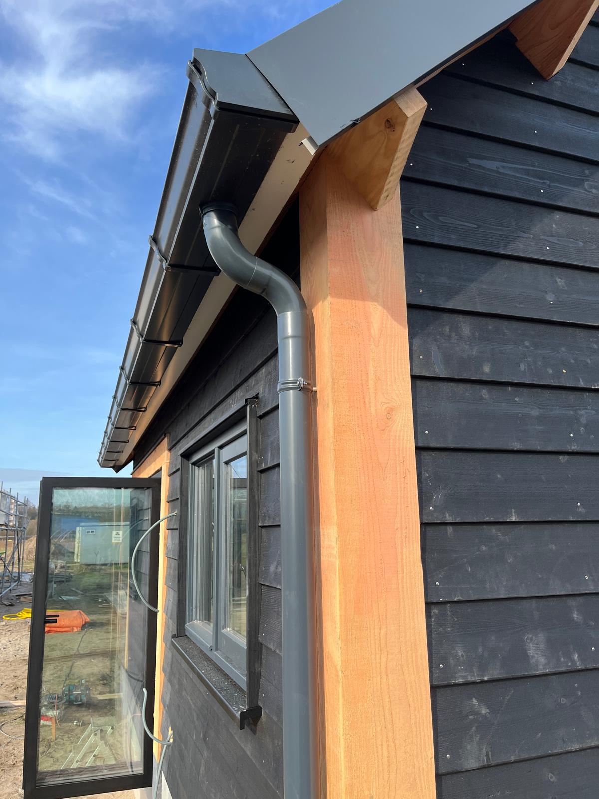 Wij als VAPE zijn de vaste dakgotenleverancier en monteur bij de Geldersche Houtbouw. De Geldersche Houtbouw staat bekend om haar duurzame aanpak en oog op circulair bouwen. Met deze kernwaarden in het achterhoofd zijn wij al jaren een ideale match. Door de jaren heen hebben wij al meer dan 100 goten gehangen in verschillende kleuren en maten, hier een aantal voorbeelden waar wij trots op zijn!